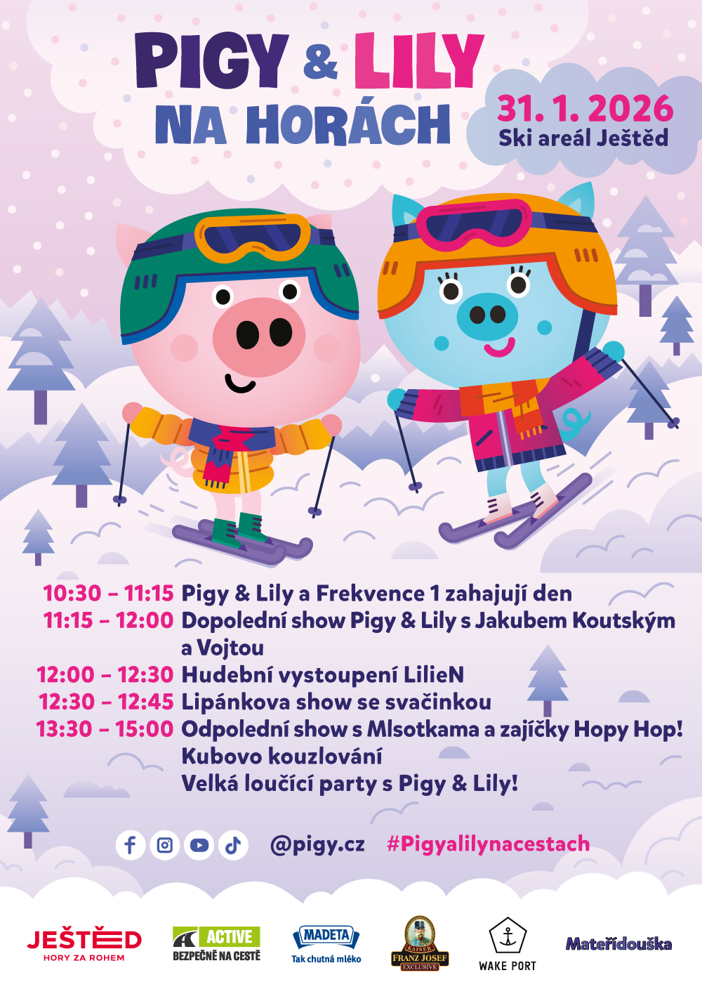 V sobotu 31. ledna 2026 vyrazí Pigy & Lily do své druhé cílové destinace českých hor a to do ski areálu Ještěd.