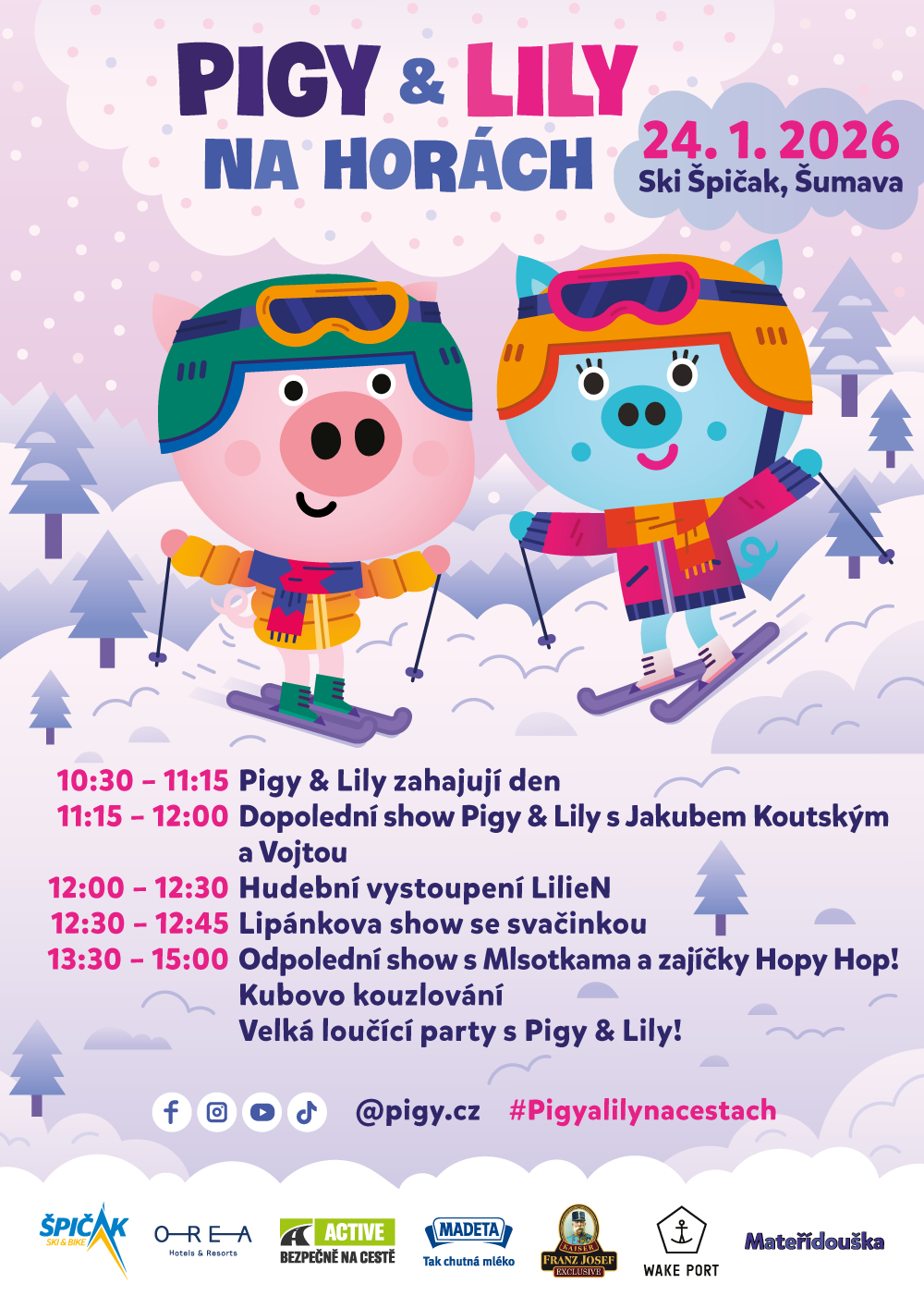 V sobotu 24. ledna 2026 dorazí Pigy & Lily a celá jejich partička do skiareálu Špičák na Šumavě.